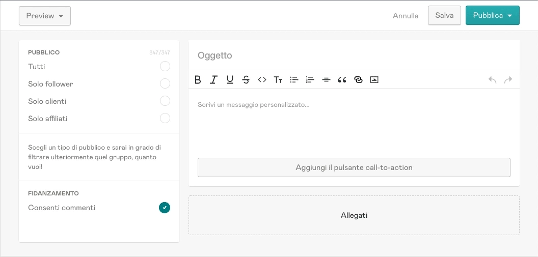Nell’editor a destra inserisci il testo del post, allegati e quant’altro. Puoi anche inserire un pulsante per una qualche call to action. E hai l’opzione per inserire PDF o video riservati solo per gli abbonati.