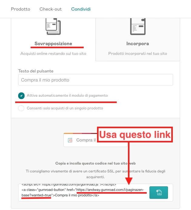 - Copia quel link e inseriscilo sul pulsante della tua pagina di vendita.