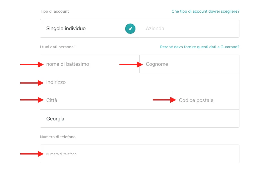 Più sotto dovrai inserire la residenza fiscale e un numero di telefono. Se il tuo account è collegato a una società, Gumroad ti chiederà anche i dati del rappresentante legale dell’impresa.