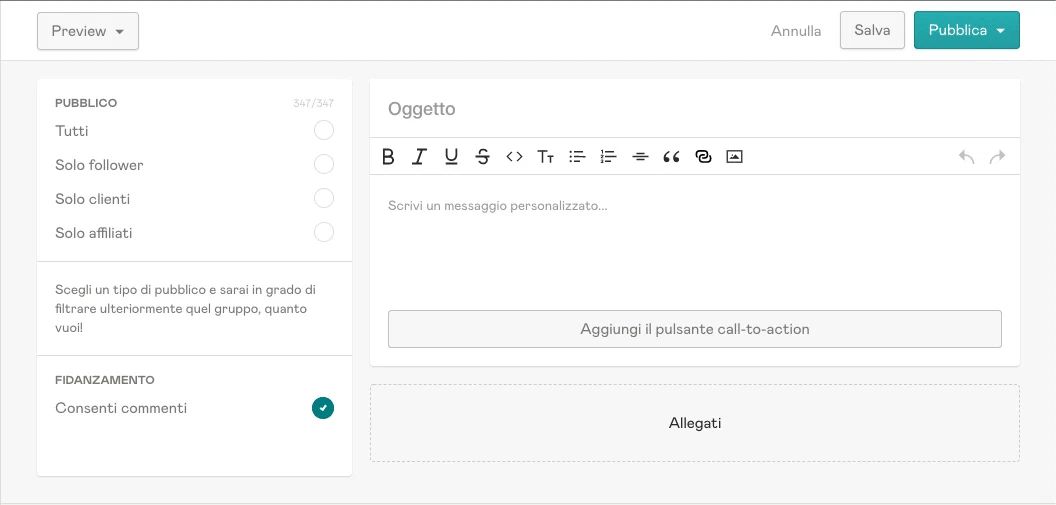 Nell’editor a destra inserisci il testo del post, allegati e quant’altro. Puoi anche inserire un pulsante per una qualche call to action. E hai l’opzione per inserire PDF o video riservati solo per gli abbonati.